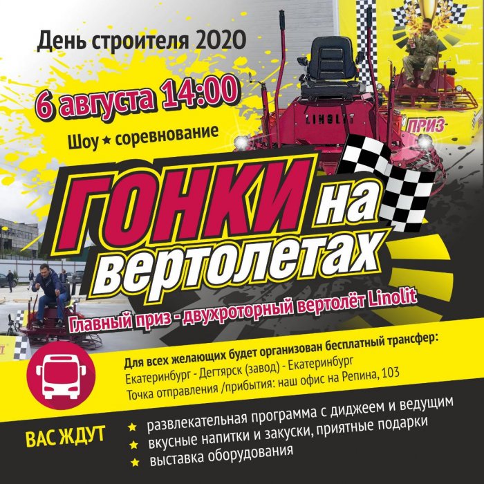 В рамках мероприятия пройдут II соревнования «Гонки на затирочных вертолётах»! Заезды на скорость и преодоление препятствий, где главным призом победителю будет - двухроторный вертолет Linolit®️ CRT 836-4!